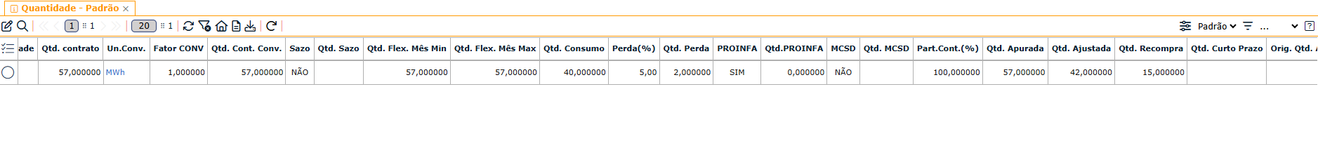 "Qtd. Recompra": indica a quantidade de recompra quando o consumo fica abaixo do limite mínimo de flexibilidade contratual. Ou seja, a quantidade ajustada é menor que o take mínimo do contrato, resultando em uma diferença de recompra.