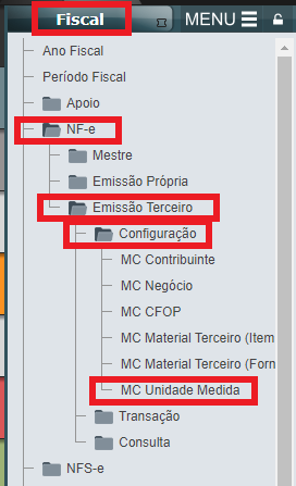 Funcionalidade: Glorian > FISCAL > NF-e > Emissão Terceiro > Configuração > MC Unidade Medida