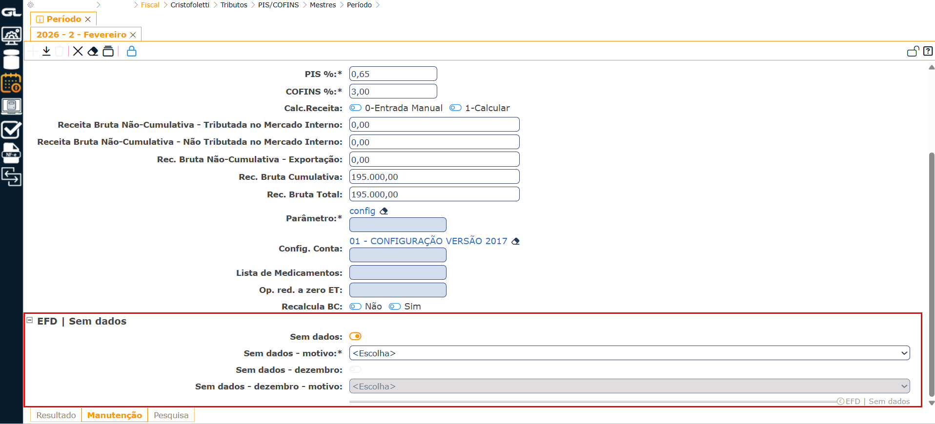 Funcionalidade: FISCAL>Tributos>PIS/COFINS>Mestres>Período.